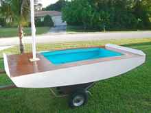 Scow #16 and also Hot Tub #6 was a kid’s version of the PDRacer that I built to take with me to the 2011 Worlds at Sail Oklahoma to entice some of the youngsters to try sailing. This scow was shorter and narrower than a PDR and featured an offset mast and rudder so that the boat could be sailed, rowed, or powered by a souped up trolling motor. With a little less rocker in her stern half and built with all lightweight marine plywood, Wedgie handled very well under both power and sail in her few trials. Equipped with a high-powered water gun that would shoot 50 feet, a beach chair, and a number of other kid-friendly accessories, I’m sure this little scow would have been a hit with the kids. Unfortunately, Wedgie was also a victim of the turnpike fire that consumed Wild Duck. Read more details about Wedgie’s unique construction and sail rigging near the end of this article: https://polysail.com/zduckupdate.htm