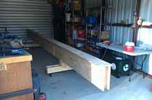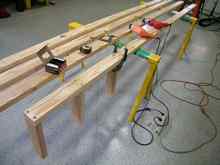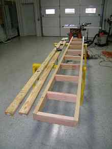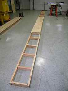 3-4" of each board was trimmed off so that when put together they wouldn't make a full 24' ladder due the length of the shop as mentioned earlier. The two ladder parts are joined with an overlapping 2"x4" board.