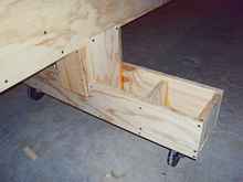 At this point the main legs barely overlapped the main beam which is all that was needed.  They were screwed on to make sure they stayed in place, but they aren’t tight.  I predrilled holes in the legs that were larger than the screws.  This allowed the beam to “float” within the two legs so that all four wheels would always be touching the floor and not rock when moved around the floor. I’ve had too much experience with uneven shop floors over the years.