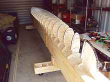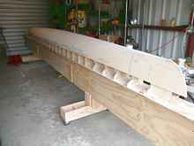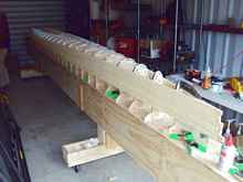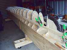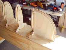 At this point in the process it was time to start tackling the forms.  Skip provided me with drawings of all the stations, and I also asked for a cad file.  My daily life is CNC machining and I thought about machining all the forms, but opted to use the bandsaw and sander to make them.  Everything was drawn out on the plywood and I began the process of making my stack of forms that would turn my 2d project into a 3d reality.  Once installed on the strongback, a beautiful skeleton emerges.