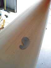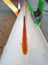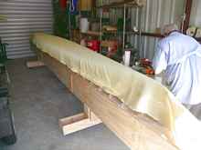 We also pulled out the fiberglass and cut it to length, then set aside.  When we were ready to start with epoxy, we rolled half of the Kevlar back on itself and coated the foam with epoxy.  The Kevlar was carefully pulled back in place and we pulled the other half back and epoxied the other half of the boat.  Once the piece was all spread out over the core, we carefully worked the fabric down the way we wanted and started to spread epoxy on the entire outside.  Once coated, we used spreaders to even everything out.