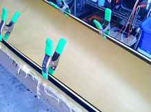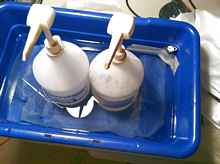 To help with any mess during gluing, I masked off the outside of the hull just below the top edges.  The Texas heat had really kicked in by this point so I got a very early start.  I arrived at my shop about 5am and got everything ready to go.  To combat temperature issues later, I got bags of ice and had them in a cooler.  I put my epoxy in a container with water and slowly added ice.  Note the thermometer in the corner of the tub.