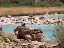 Craig Wolfson lounges on a boulder beside the amazing turquoise waters of the Little Colorado River. Another tough day on the river.