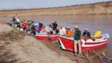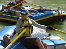 The ever-cheerful Yoshie Kobayashi rowing the Hyde on the mud-brown waters of the Colorado River.