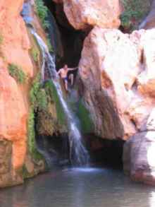 Natalie, Cece, and Richard in the amazing Deer Creek Canyon, nearing the patio. The narrow slot to their right is a hundred feet deep, and narrow enough to jump across if you're stupid enough to try.