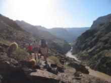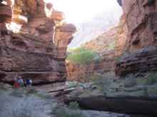 Natalie Mortenson, Cece Mortenson, and Richard Carrier heading out on their Deer Creek-Thunder River-Tapeats Creek loop hike, with a can of coconut juice, a few sandwiches, and 8,364 games of "I Spy" in their near future.