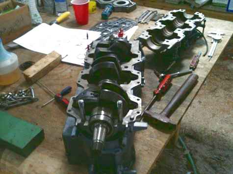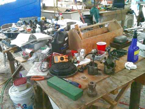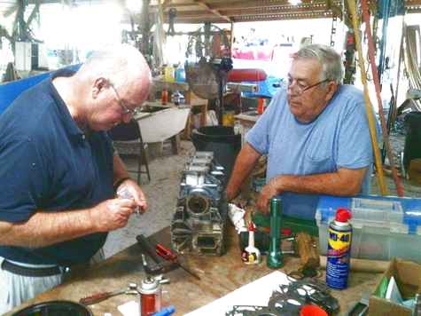 Phil was all down about it and couldn't understand why the rest of us were happy and excited. Phil's the new guy around here and hasn't seen Howard at work. Howard's the old guy with hair in these pictures. We have access to wholesale motor part prices from a company that has everything. You can see what happened. The whole dam thing was taken apart, broken bolts drilled out, cylinders reamed out, new pistons and bearings put in, new pumps all round, carbs overhauled, all put back together and the thing runs like a sewing machine. You have to see it done to believe it, parts strewn all over the place.