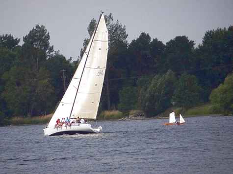 Crazy Steve puts us all to shame, if that's the right word for this category. See this tiny little sailboat out in the middle of the St Lawrence river with all the big boats? It's our Steve in his Wee Lassie schooner. For you who aren't familiar with this boat, here's me holding one with two fingers. Jam in a couple of broom sticks and you have a schooner, if you're not big and fat like most of us and are indeed crazy you could sail this thing, in a swimming pool! Here's an e mail from Steve of where he went in this toy.