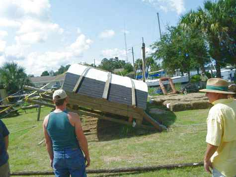 They had all kinds of cables and ropes and winches and poles rigged up and they managed to turn this thing over with no damage and no injuries. When the 3000 pound hull was all the way up and past the tipping point it refused to go on over without a little help. After you look at the pictures click on this youtube link to see it in action. It wasn't suppose to be a nine minute video but you'll see why. It was a fun day in spite of the heat, not something you'll see very often.