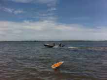 The next test was a 2hp outboard: She performed STUNNINGLY. Two passengers, one on the stern seat one on bow seat to trim her out. The pootled about for a bit, then started playing with the motor - the had the boat turning in its own length! They'd just go round and round, then slam the outboard over to the other tack, and go round and round that way.