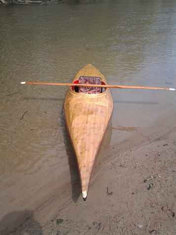 This is my interpretation of a Bamboo yak. Western Red Cedar frame skinned with heat shrink Dacron then Bamboo veneer panels for sides and hull. Bamboo veneer (thin and solid) for the deck. Bamboo slats - scrap from rudder bows, red wood rubrails, yellow pine for coaming. Haven't put the lip on yet. That will be redwood as well. Turned out to be 12'3". Used stations like the Egret that I built last year. I think this thin bamboo veneer would work well with a Baidarka. Also five coats of west system clear (207) hardener. Still need to put on varnish, using Epiphen.