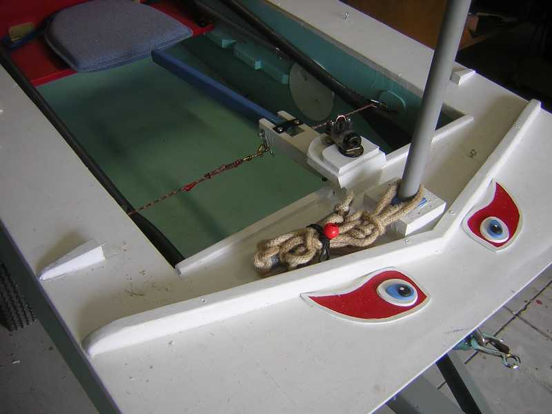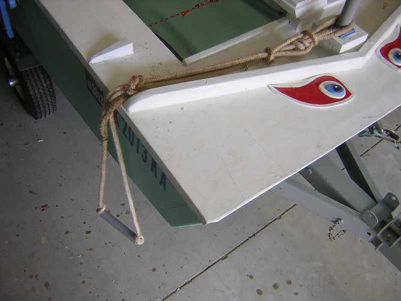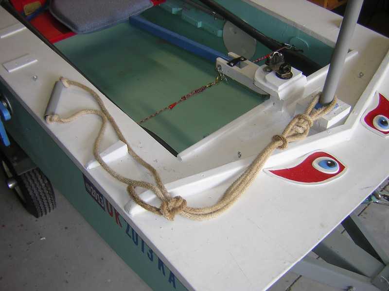 The photos should show you how I looped the boat end of the rope in such a manner that I could slide the mast through the loop when rigging the boat. The loops of rope were tied to hold the piece of 3/4-inch PVC pipe in place. With the short width of the Puddle Duck, and the Stirrup Ladder attached to the mast, the ladder is reachable from either side, should the boat be knocked down and is resting on it's side.