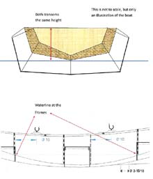 Alby has its' two transoms whose top side is the same height above the waterline. This is wonderfully convenient for measuring and it has a neat level look on the water. I think a level sheer in an 8 footer looks good. Not only that, the waterline hits the hull right at two frames, so the hull will be stiff right where the water challenges the plywood.