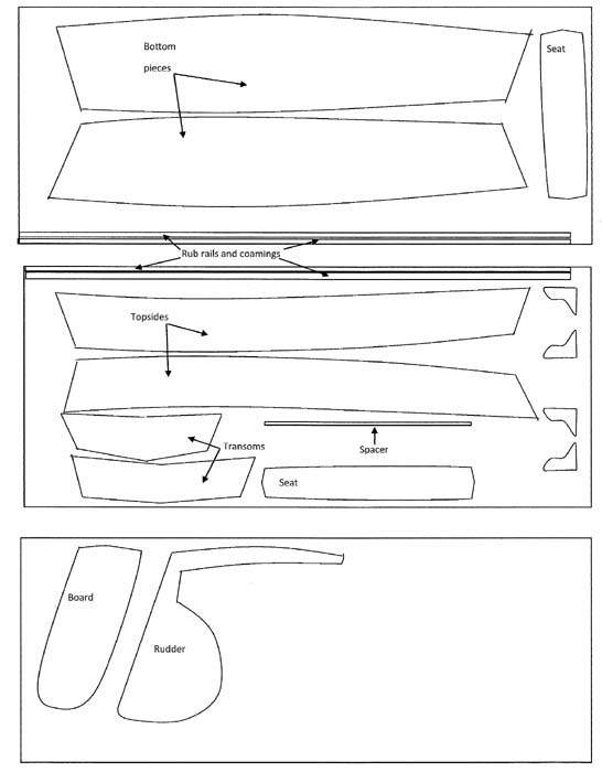 A good designers should have two things in mind. First, he should try to lay the pieces out which go together in the sequence he wants you to build it. Now this is not always possible, but the closer he can come to doing this the better for you. Topsides on the same plywood sheet with thwarts (if possible), bottom pieces on the same plywood sheet with rub rails, transoms and sail gear together.