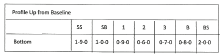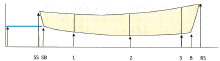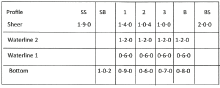 SS stands for stern sheer, SB stands for stern bottom, and BS stands for bow sheer. I've put some numbers in for you to see how tables look. However, tables differ. The simple table above is only heights, which is why the numbers across on the waterline are the same.