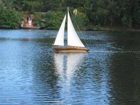 Pride of the fleet (in my books), the fleet flagship is Keith Griffin’s absolutely lovely model of the Fife schooner Altair which built over eight months from the late Sandy Cousins plans available from Marine Modelling Inernational’s Traplet Plan Service. He’s done a wonderful job indeed and produced a model that attracts attention and plaudits from passers by. Crewed with good figures, it sails really well.