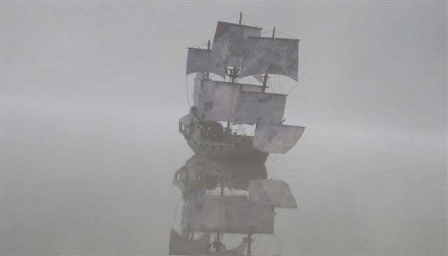 Harry Duncan's pirate ship BlackRose early on the lake on a misty morning.
