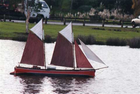 Alex Bartlett’s RC sailing dhow was built plank on plywood frames, the plans scaled up from a book and is just over a metre in hull length. The sails he made of a synthetic material purchased and the keel and bulb overall weight is approx 5 lbs.