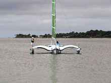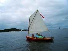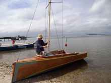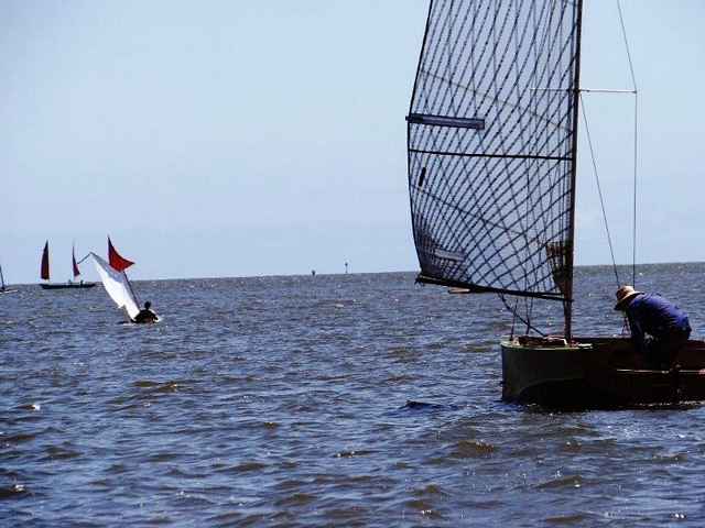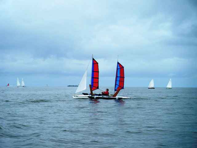 I'll comment on a few; the first is Chuck the Duck from Duckworks magazine in a fine new hat, the second is a new home built he's doing for next years meet. I've included a few more of Steve's tiny ketch rigged Wee Lassie. He's actually out in the ocean with the rest of us "big" boys in this eleven foot long, twenty pound open canoe and loves it and does just fine. My favorite may be the one of Judy's "Freedom" with it's perfect sail, Stan and Gayle in his double kayak and me and Helen in "Helen Marie"; looks like we're all out in the middle of someplace floating in the air. Notice that Jay's custom race boat is behind Steve. Pete the Plumber found the shallows in his space ship looking tri. This gathering really is as fun as I always make it sound. You just show up and do whatever you want to do. The whole dam place is only about a mile wide. Any of these hundreds of guys will drop whatever they're doing to help out or answer questions. The only organization is the great meal you can get from the Trailer Sailors on Saturday evening if you can wrestle a ticket away from Ron.