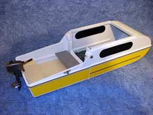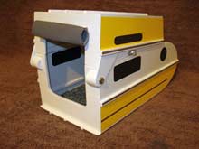 Then, when the sun is going down, head to shore, pull onto flat dry land and start the conversion process. First, place the rear seats and motor into the camper module, and any gear as well. Most everything should store beneath the seats. Unscrew the safety bolts, and gently lift the rear boat module onto the top of the camper module. It actually pivots up, so the weight is minimal. Next secure the top with 4 small bolts, and prepare for a comfortable evening sitting in the camper. There is no stand up headroom, but plenty for sitting. The whole process should take less than 10 minutes! An option is to load the camper onto it's transport vehicle for even more security.