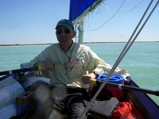 Soon Doctors Pass slid by, but the wind began to ease as Gordon Pass approached. Unreefing the main only seemed to encourage a further absconding. It was a repeat of the first two days where winds blew from east of north, sometimes boisterously, in the morning and then eased toward noon to be followed by a northwest wind. In this case, it took around two hours for the changeover as our speed dropped from nearly 5 knots to 2.5 to 3. Just past Gordon, it almost completely died and Chuck broke out the oars to row, before the new wind finally filled in. But the slow passage gave us a chance to study Gordon from offshore, which has a bad reputation among Watertribers. We could see why. The northern side of the inlet had continuous breakers, even in the calm seas of that morning. The south side had the marked channel and a stream of powerboats were heading in an out. We didn't know it at the time, but Gordon lived up to its reputation that year as veteran Watertriber Nick Hall, with his nephew, lost their Hobie Tandem Island trying to enter Gordon. They were able to reach shore uninjured.
