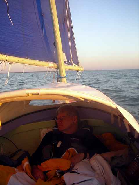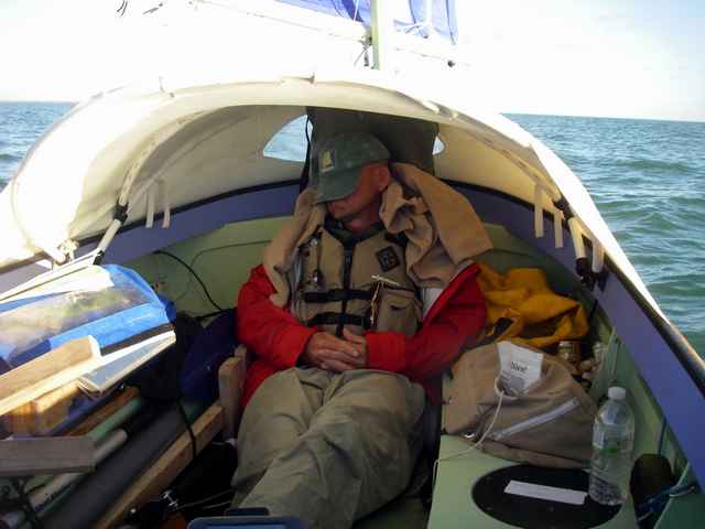 Gary resting: Gary naps as Chuck steers down the Everglades Coast. Getting enough rest is critical to an Everglades Challenge.