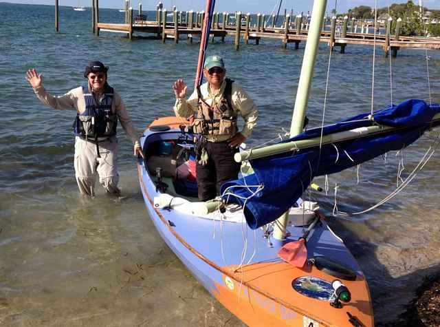 Finish: Two happy sailors at the finish line at the Bay Cove Motel in Key Largo after a sub-6-hour crossing of Florida Bay from Flamingo.