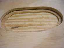 To start with, I needed a template (not to be confused with the word pattern that I use later for something else). This isn't going to be the final size of the patches, but somewhat smaller. I measured the largest area to be patched and cut a somewhat smaller template from some scrap plywood using a band-saw. I had decided that obviously irregular shaped was probably better than close to perfect, but not so perfect as to be reversible. I also figured sharp corners are likely to lift more than rounded ones, so I cut it free hand and ended up with an odd, faintly kidney shaped template.