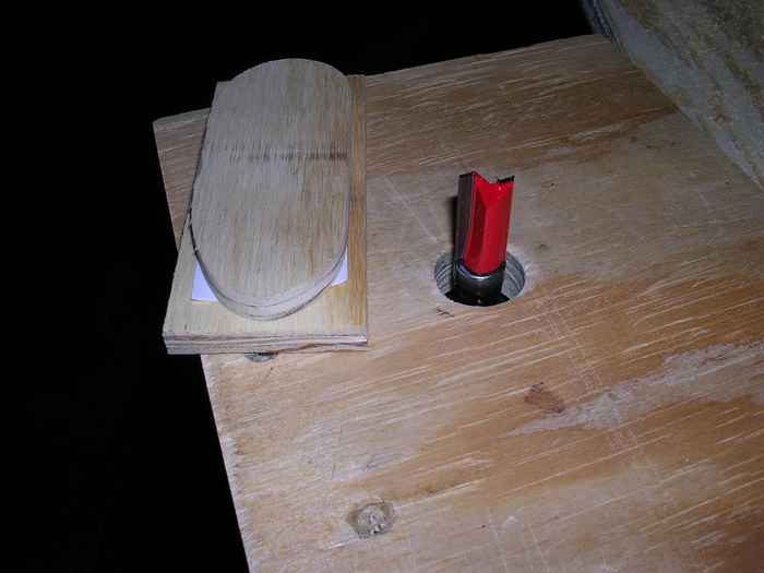 The female pattern is either clamped or double face taped such that it surrounds the knotholes in the plywood. The bushing runs around the inside of the pattern and the bit cuts out the knot. To set the depth of cut, I simply positioned the bit in one of the knot holes and let it rest there while I tightened the router's depth setting.