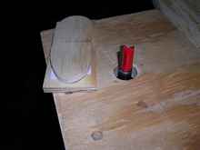As mentioned before, the male pattern is used to make the patches. I re-sawed some scrap 2x lumber into 1/4 thick strips slightly wider than my male pattern. Double faced tape affixes the male pattern to the patch stock, and a flush trim router bit is used to duplicate the male pattern (may need to trim it close with the band saw first). The picture shows my trial patch using plywood as the patch stock.