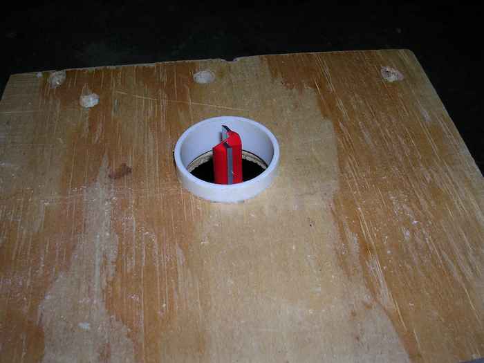 I made the bushing by cutting off a short section of 1-1/2 inch PVC sink drain "tail extension" which surprisingly measures 1-1/2 inch outside diameter. I say surprisingly because most pipes are 'named' by a nominal size which seems to bear no relation to their actual size. The size of the bushing is actually what dictated the size of the router bit. I'd have preferred a 1/4 inch bit and 3/4 inch bushing, but I didn't have any pipe with an actual, measured 3/4 inch outside diameter lying around. I mounted the bushing by screwing a piece of 3/4 inch ply to my router's base plate, and drilling a 1-1/2 inch hole through it. To get it perfectly centered, I started by putting 1/4 inch drill bit in my router's 1/4 inch collet. With it unplugged, I then allowed the weight of the router's motor to rest on the bit as I turned it by hand a few revolutions. This sufficiently marked a center point on the plywood. I then removed the router's base (plywood still attached) from the motor and drilled the 1-/2 hole with a Forstner bit in a drill press. The bushing fits snugly enough to stay in place without any fastening.