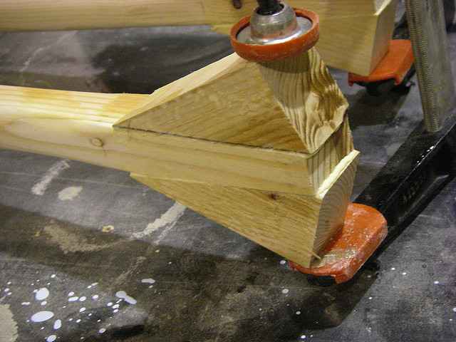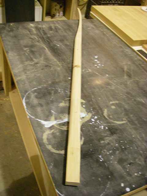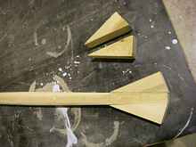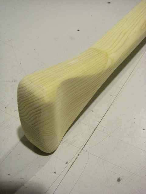 The near end is the blade end. It has been shaped to receive the plywood blades. The far end is the handle end. It is left square to receive the wedges (ears) that will fill out the full grip shape.