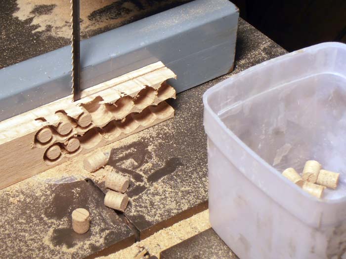 Take the piece over to your table saw, or bandsaw. Set the fence to give you a width where the cut will just clip the bottom of the plug as you rip along the length of the wood piece, this cut cleanly frees the plugs from the wood piece. It will though spit the detatched plug out sideways away from the blade so have a small box sitting alongside the cut to collect them.