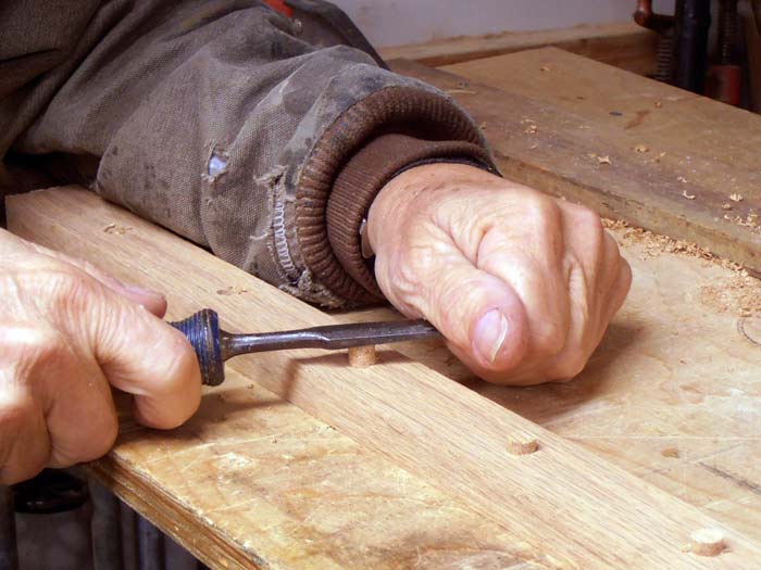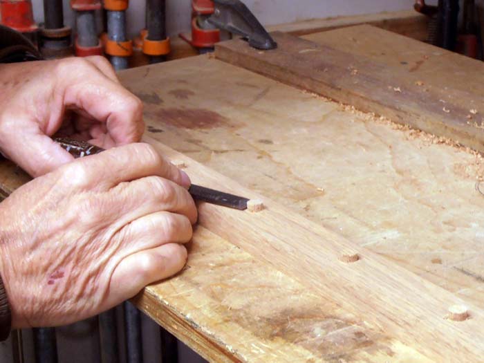 Back to driving the plug in. Don’t hit it with a hammer, that compresses the plug of wood, I press it in with the back of a chisel blade, just firm hand pressure.