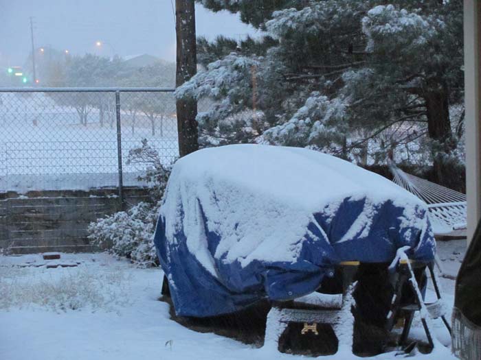 | Well, a couple of days ago I could go outside in comfort with no jacket. Winter decided to hit this weekend. The sun had eaten up the outer tarp I had covering my Toon2 so I went and got a new one yesterday and got it put on just in time. This is what it looks like this morning. |