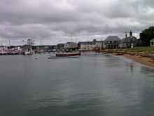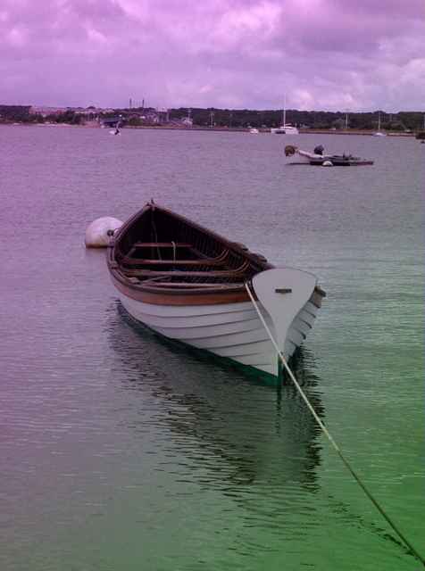 Of course I had just missed the ferry and had almost two hours to wait for the next one, I figured I would go do some sight-seeing, but found there were no lockers to stow my stuff in, and there was no way I was going to make it far on foot lugging all that junk. I ended up wandering over to the beach so I could put my stuff on a bench and enjoy the view. It also gave me a chance to check out the two large gigs moored just off the beach I had noticed when we arrived earlier in the day. I recognized the type of boat as one I have seen in races sponsored by the Hull Life Saving Museum and know them mostly from what I had read about them in MAIB, and from the view afforded a slow dory (redundant, I know) rower as they came into sight, and then flashed past during races, usually with a funny comment or wave from the cox.