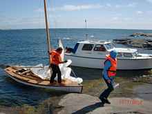 However the big catboat, despite reefing, capsized in the squall. The crew righted her but she was swamped. With Ville's help on Rainbow, the safety boat, she was towed to a shoaling island, bailed out, and set on her way arriving only about an hour after the rest of us.