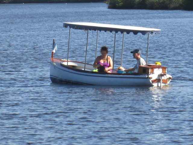 You see from the pictures and video that this is a long, long line of boats. We had 28 boats tied bow to stern behind Chelsea that stretched out over a distance of 750 feet. They always talk about "football fields", that's two and a half football fields long. Think about the logistics of doing that. The wind was blowing onshore so we had to hold the boats off as we tied them together or they would've blown into the bushes. In these 28 boats there were 30 people (two were doubles) who were as interested in drinking beer and talking to each other as getting going. And we've already established that this bunch was not what you'd call your normal rational people. If they were they would've been home watching college football. We thought about having Steve anchor out with a long line but in the end I just tied the first two boats together, yelled "Man Your Boats" and starting walking out across the lagoon. It's only about four feet deep. As I pulled, the crew tied boats on and pushed people in. It didn't take long to get this herd of cats going because I didn't stop walking and the boats kept going out. At one point when I was about a hundred yards out and up to my arm pits in water and getting stuck in the muck I had a doubt about the wisdom of this plan. Way back in the distance I could see that more than half the boats were still on the beach and it was getting hard to pull. Luckily about then is when I started to come up on the sand bar and I knew I could make it. Stan tied my boat on somewhere in the back and he was going to be last until some more showed up and quickly tied on behind him. I think you can see in some of the pictures that I've tied on to Chelsea and way back in the distance boats are still coming off the beach. My job was over and I just had to stand on the sand bar till my boat came by, accepting beer from passing boats.
