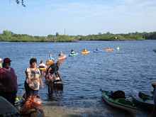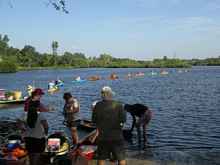 You'd think this would be done more often but it's not, maybe never. If you mention getting a tow to a kayaker the answer is always something like, "we do this for the exercise or I like the calm and quiet" or any number of other reasons; all of which are valid and acceptable. I have to admit that this particular "train" was a little extreme but when I put the word out that we were going to set the world record for the longest kayak train pulled by a Briggs and Stratton lawn mower powered African Queen looking tow boat, there was no stopping the flood of truly warped kayakers who wanted to know what the hell I was talking about. You should have seen the looks I got when I said that no paddling would happen and tried to get them leave their paddles on shore and that once hooked up you could not be unhooked. That one got the most comment till we said think about it. Ever tried to untie a line from the front or back of a kayak while you're in it?