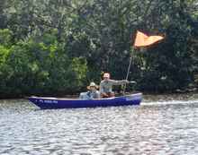 We've done this lots of times with fewer boats and it is really fun. Leave it to a bunch of old retired guys to find an easy way to kayak. You're still sitting in your little boat enjoying the sights and sounds of nature while slipping smoothly through the water. It's really relaxing and since you're not paddling you can look around, take pictures and actually see more of what's out there than if you were struggling to go against the wind with your muscles burning and you heart pounding and your lungs, well you know. The boat towing you has to go about the same speed as you would normally paddle so it's not noisy or making much of a wake. A train of about ten boats is ideal for this, even in narrow twisty rivers. The kayaks follow exactly in the wake of the tow boat. You'd think they would try to cut the corner or crack the whip but they don't. The first time we did this we expected disaster and had quick release knots to let go when death approached. After a few timid turns Howard, who was driving did some tight U turns and we all stayed in one wake. He made one turn around a crab pot buoy as tight as he could and no one hit it. This while pulling a string of 14 kayaks.