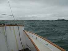 What a sail! Still double reefed, the little boat fair scampered along with a great white wake, bouncing and rolling through a steep chop that the 20 knot wind had set up blowing against the tide, the lowering sun making the water a very deep blue against which the cresting wave tops were amazingly white.