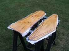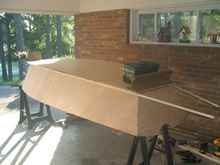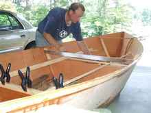 The next step was to add the bottom panel to the side panels. I was using ¼” plywood, so I decided to epoxy two thicknesses together to give the bottom of the boat plenty of strength. I offset the joints in the two layers so butt blocks were unnecessary. The plans did not give offsets for the bottom; instead, it called for cutting the panel a little oversized and then marking the outline from the side panels. Here is a picture of the bottom laid across the side panels.
