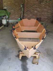 The side panels and transom are stitched together with temporary frames inserted along with the gunnels simply clamped into place for stiffness. You can see my butt blocks. I had been told that they would create flat spots in the hull and they did. I had a little trouble getting those flat spots to “disappear” when I was I fairing the hull. In future builds, I plan to give scarffing a try.
