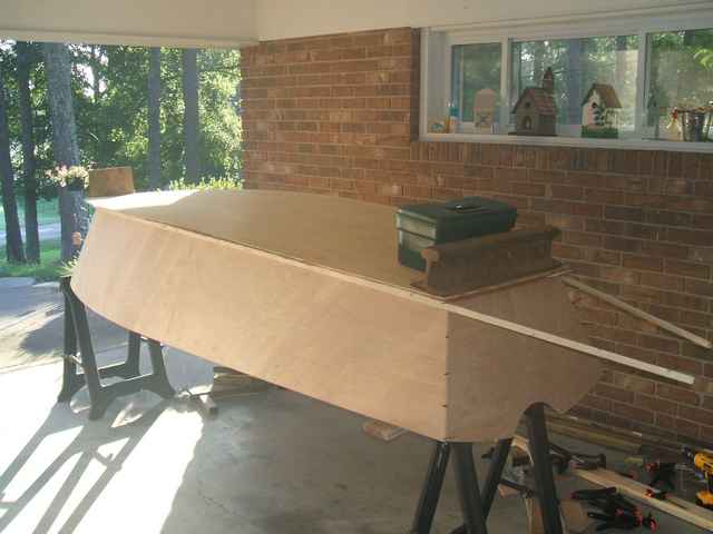 You can see that I screwed temporary battens to the side panels to get a fairer curve. I marked the bottom panel with a pencil and marked corresponding points on the bottom and side panels for the small holes that I would drill for the “stitches”. Once I cut the bottom panel to fit, I stitched it on and then sealed all the interior joints with thickened epoxy fillets and wetted out 3” fiberglass tape. I use wood flour that I get from a local cabinet maker to thicken my epoxy. I ask for the finest saw dust that he has and then I sift it through a wire strainer to get out any shreds of wood. What is left really is fine as flour. It works great. Before doing the interior joints, I applied tape to the outside of the joints to keep the thickened epoxy from getting pushed out when I shaped the fillets. It turned out that my fit was pretty tight and it was hardly necessary. Once the tape and fillets hardened on the inside, I sanded the outside of the joint round and applied a layer of wetted out tape over the joint’s exterior. You can see in the picture that I have also glued the gunnel on with thickened epoxy. The pvc pipe makes excellent clamps for this. Here is a picture of the hull after the joints have been “stitched and glued”.