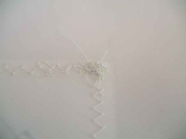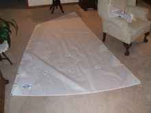 About this time I had to have some surgery which put me out of commission for a couple of weeks. I was not able to do any heavy work but after a few days of recuperation I was able to build my sail from the kit that I bought from Sailrite. They had the specs for the SD11 in their data base; so it was easy ordering. I am not much of a seamstress but overall the project went fairly well. Most of the stitching looked pretty good although I did wind up with a few “rats’ nests”. Here are a couple pictures: