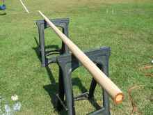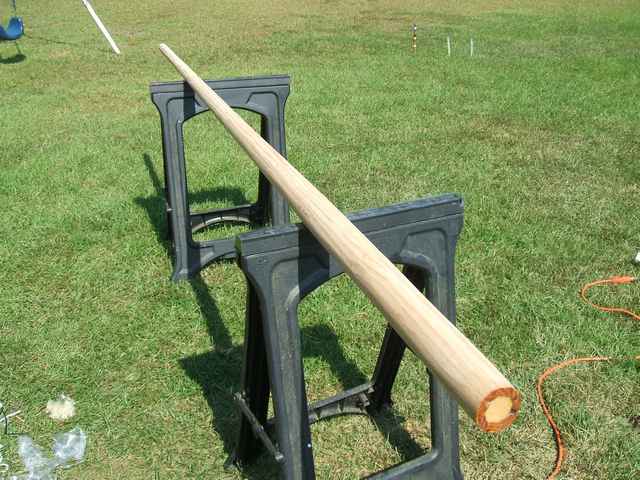 By the time I finished the sail, I was able to get back outside. The next big project was the birdsmouth mast. I had wanted to build a mast using that technique for a long time. It was time to try it. I went to the local lumber store (not one of the big box stores) and asked for a clear piece of spruce. They had a pretty nice piece of wood; so I bought it, took it home, cut it into 8 staves and notched a modified birdsmouth into each one. I used a simple jig to cut them. They were not quite as uniform as I would like for them to have been; but they worked out. I think that a feather board would have helped a great deal. I don’t think my $100 table saw was a great asset, but I imagine a skilled craftsman could have gotten at least somewhat better results than I. After notching the staves, I tapered them with the table saw. I have read that some, if not most, taper their staves with a plane. I only own a small plane and felt I could get better results with the saw. I glued up the staves using short pieces of rope twisted tight with screw drivers. I did wrap pieces of boxing tape around the staves to prevent the rope from sticking to the epoxy. I also wrapped the ends of the tools with tape. It helped, but afterwards all my tools were a bit rough from thickened epoxy getting on them. I rounded the mast with a belt sander using up and down sweeps of the sander. I started with coarse grained belts and worked down to finer grained. I just “eye-balled” it until I got it rounded to my satisfaction. To help hold the mast while sanding it, I tacked two parallel strips of wood onto my wooden trailer bed. They were just far enough apart to keep the mast from rolling. I did have a few gaps between staves that I had to fill with thickened epoxy. I glued a plug into the bottom, sealed up the top and cut a bee hole for the halyard. The mast is not perfect: it has a few “flat” spots but all in all looks pretty nice.