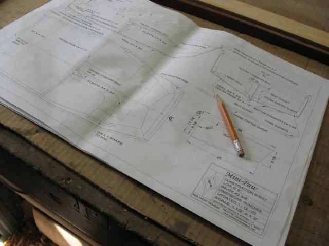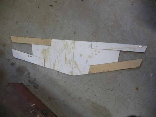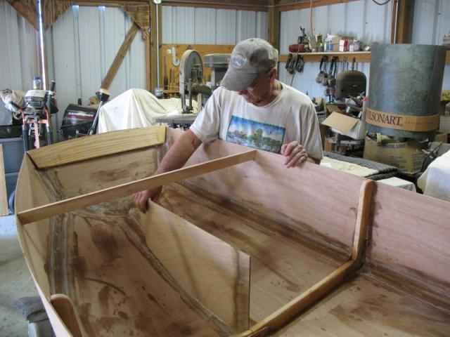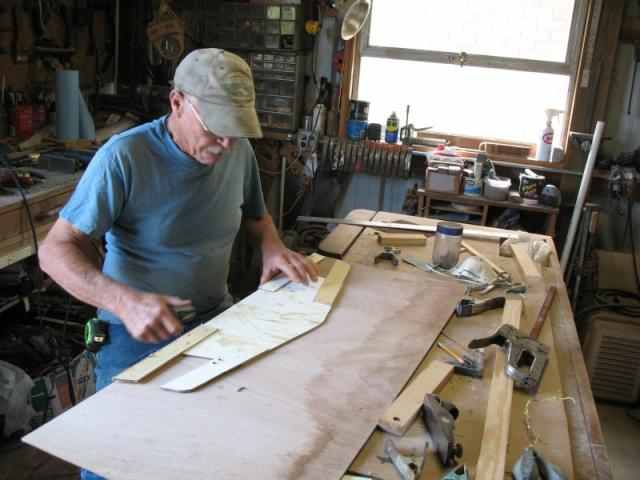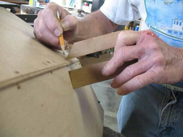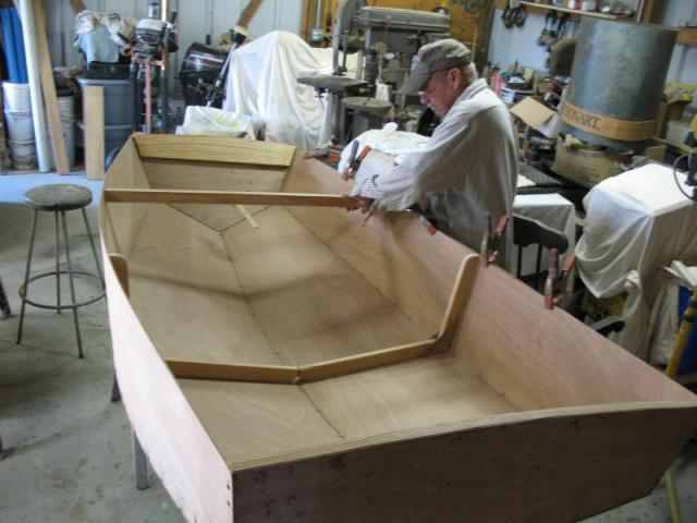 I'm building a storage compartment in bow of dinghy, which isn't on plans, so every thing has to be built "in place". After much measuring, re-leveling, re squaring, etc, a pattern was made from heavy cardboard for the cross ways (thwartships) bulkhead.