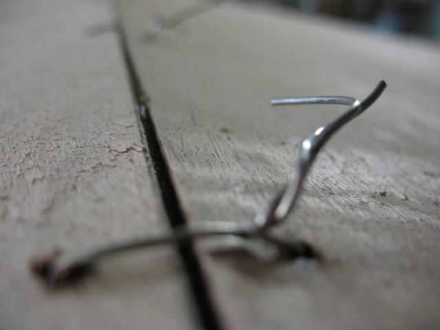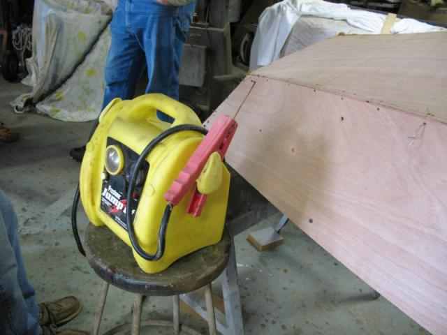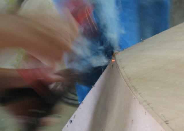 And "POP" the other side. All it takes is making a spark. Too long and the wire goes red hot, and scorches the wood. Not a problem if the boat is to be painted. Catching that tiny spark was NOT easy.
