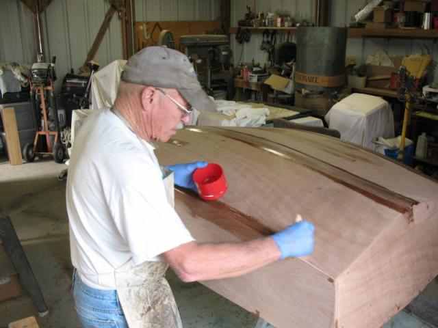 Pre-wet the areas that'll be taped. Note the keel was done first so there's no need to lean across wet epoxy. Obvious huh? See the apron?