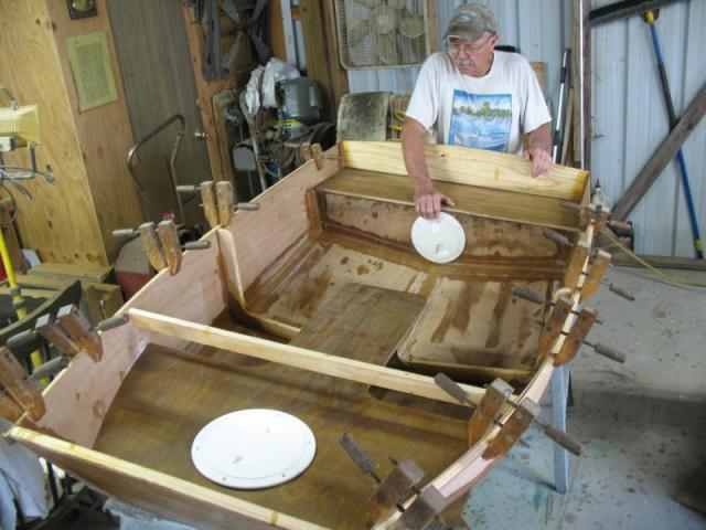 The dinghy was begun 15 days ago on Weds the 23rd. I was pretty much out of epoxy, and needed the fiberglass too, so it's been a wait kinda time. I did use up the very last of the epoxy to coat the forward thwart.